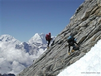 Base Camp in a grassy meadow near a glacier stream. The camps are stunning as well. C1 is on a rocky slab, C2 on a bedroom size space on top of the Yellow tower and C3 in a dangerous area underneath the 'Dablam' - this area avlanched in 2006 killing 6 climbers.